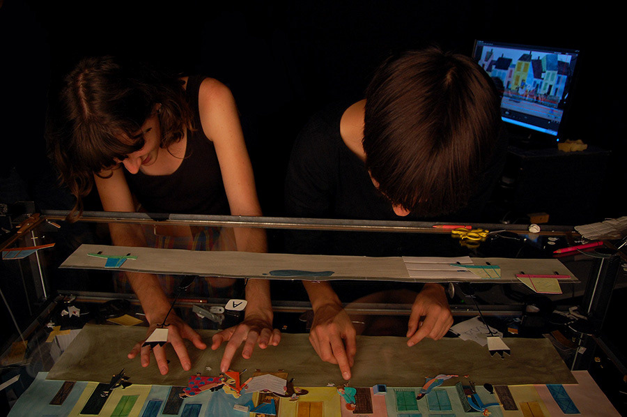 The film was shot at locations of Folimage studio. Everything was animated directly, together with backgrounds. That's why the compositing wasn't that complicated. I intentionally wanted to have all the elements together from the beginning because I really like the imperfect shadows created by the layers of paper put together. I think it's something that could never be simulated digitally.